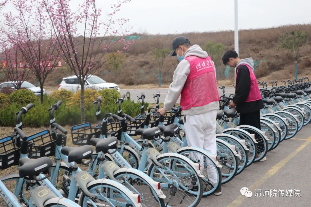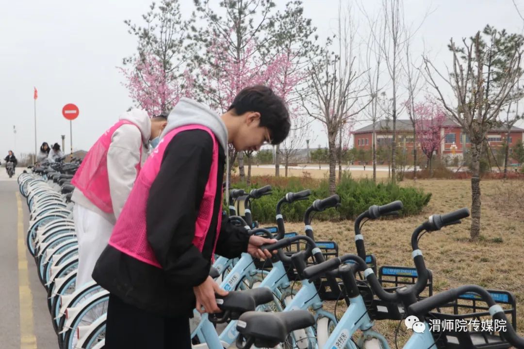 共享单车的随意堆放,既不利于道路安全,同时破坏了校园整洁环境。在富平校区主教学楼前,志愿者们相互配合,有序分工,将路边的单车摆放好,清理车篮中的垃圾,在同学们的努力下,原本停放不当、杂乱无序的共享单车变的整齐划一,让同学们的出行变得更加安全便捷,也使校园环境更加优美。