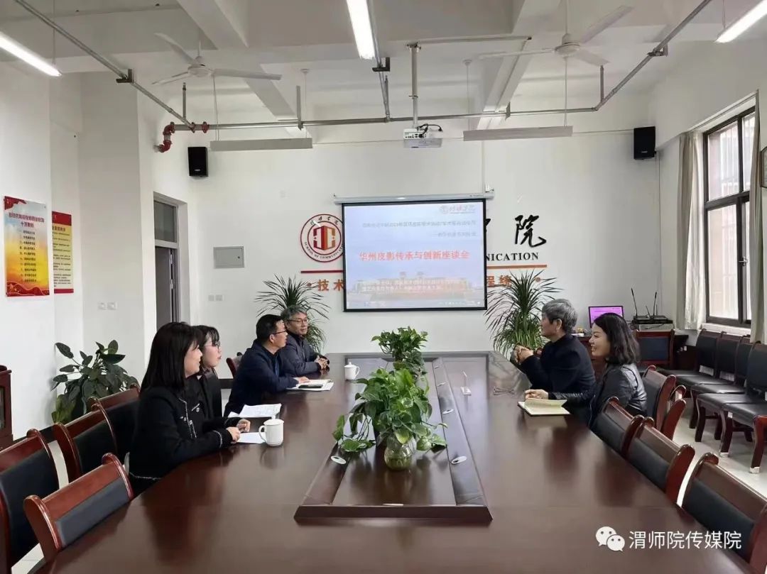 讲座结束后,相关教师代表在富平校区1105会议室参加了座谈会,曹熙斌经理介绍了公司在皮影方面的研究情况,教师代表依次介绍了自己的科研方向,并与薛宏权在皮影风格动画作品创作、皮影艺术理论研究、高级别艺术项目合作申报等方面进行了深入交流。