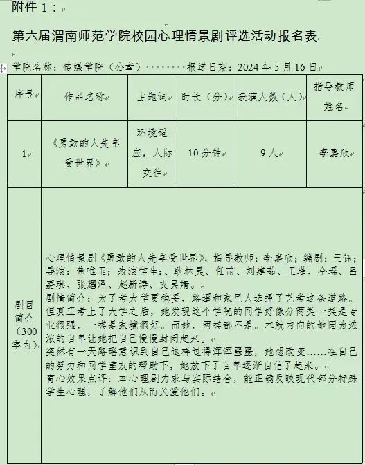 按照第六届美加墨世界杯官网校园心理情景剧大赛要求,mjm世界杯官网积极选拔优秀剧本参赛,精心打磨剧本。最终推选2022级戏剧影视美术设计专业员工自导自演的作品《勇敢的人先享受世界》代表公司参与评选,并晋级复赛。