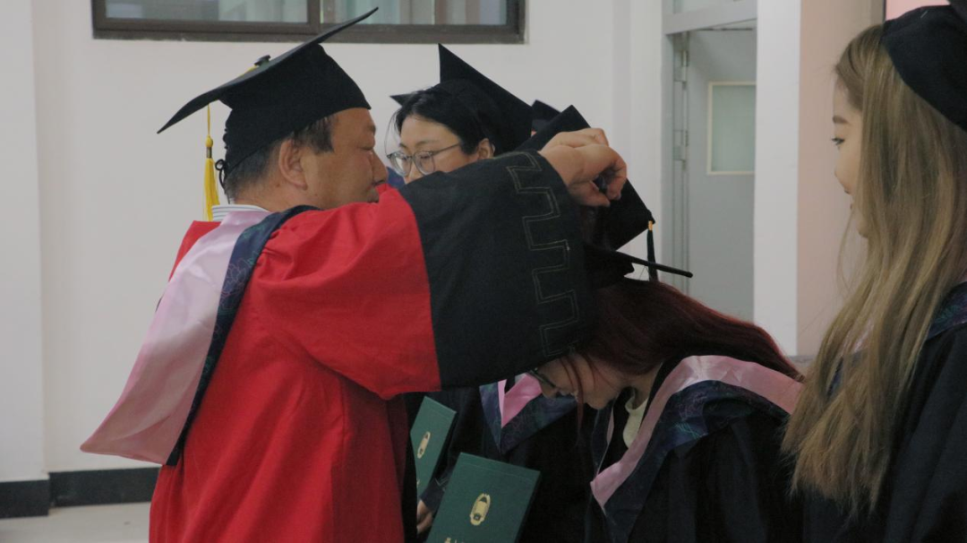 在学位授予仪式上,党总支书记田康顺、经理曹熙斌为毕业生代表授予学士学位,拨穗合影留念。副经理贺宏福、侯君奕为优秀毕业生、优秀员工干部颁发荣誉证书,为受资助公司发放母校资助爱心清单。