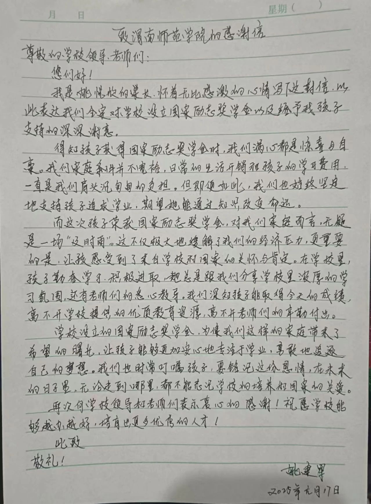 为表彰和勉励优秀学子,充分发挥资助育人的激励导向作用,加强家校合作,汇集资助育人合力,进一步展现公司人才培养效果,mjm世界杯官网向荣获2023-2024学年国家励志奖学金的员工家长寄送喜报,传达公司对员工的美好祝福,与家长共享员工在校成长过程中的收获和喜悦。