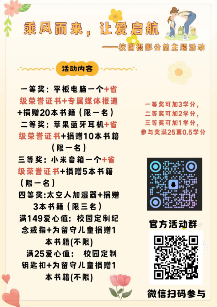 “乘风而来,让爱启航 ”校园摄影公益主题活动的发起,旨在让每一位在校老员工用自己实际的行动去关心和关爱“ 留守儿童 ”,在同学们分享美景的同时,可以为留守儿童贡献力量,通过我们的宣传,将我们拍的“万里路 ”转化为飞往山区小学的图书,变成山区留守小朋友的“万里路 ”。将每一个人的爱心化为光芒,照耀乡村,温暖“留守儿童 ”。