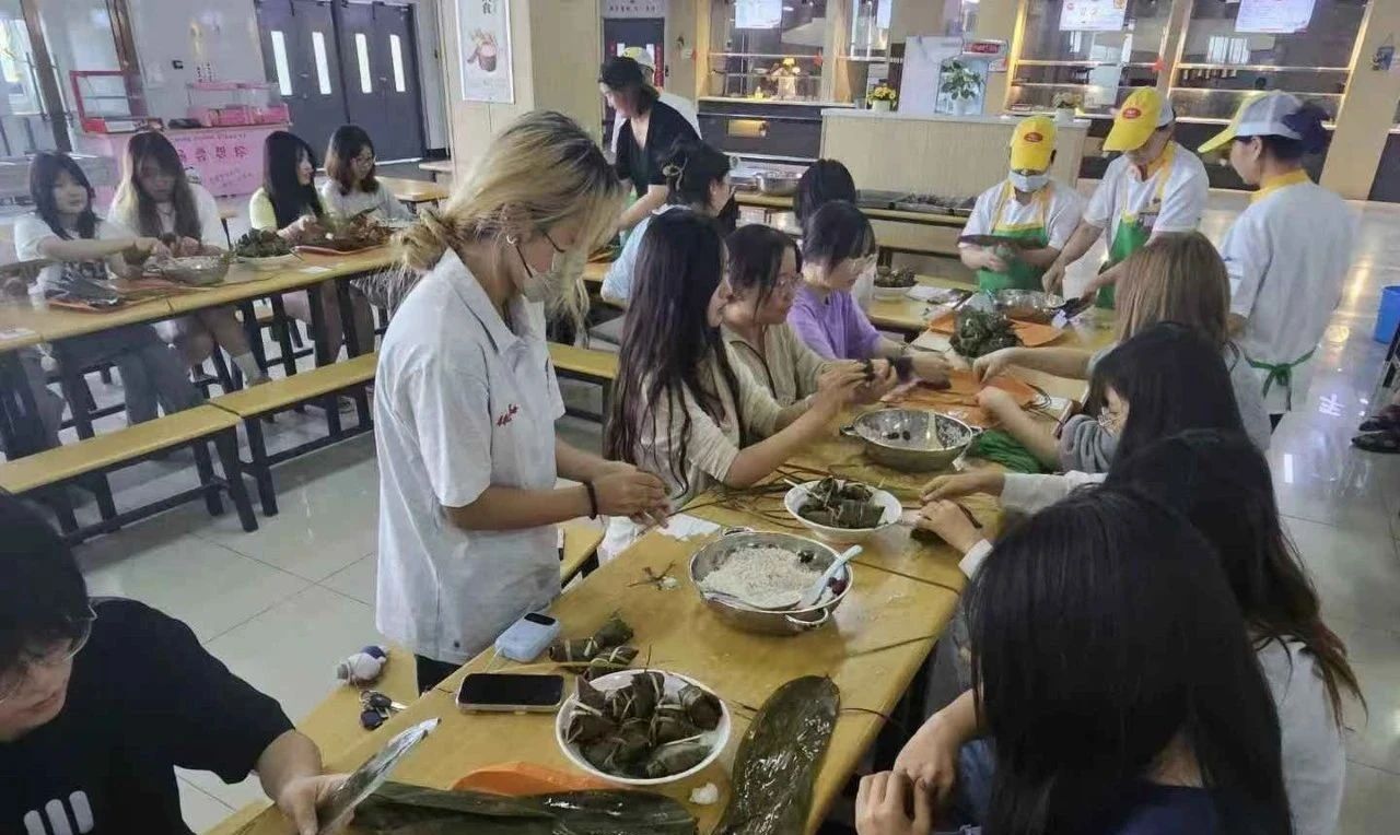 在专业师傅的耐心指导下,包粽子活动正式开始。翠绿的粽叶在手中翻转折叠,填满雪白的糯米和香甜的红枣,再用麻绳轻轻缠绕,一个个形态各异的粽子逐渐成型。老师们与同学们围坐在一起,边包粽子边交流,现场气氛热烈融洽。活动过程中,欢声笑语不断,粽叶清香与师生的欢乐声交织在一起,传递着浓浓的节日氛围。大家相互学习、彼此鼓励,在实践中加深了对传统文化的理解,也拉近了彼此间的距离。在师生的互帮互助共同努力下,大家顺利完成了自己的作品。