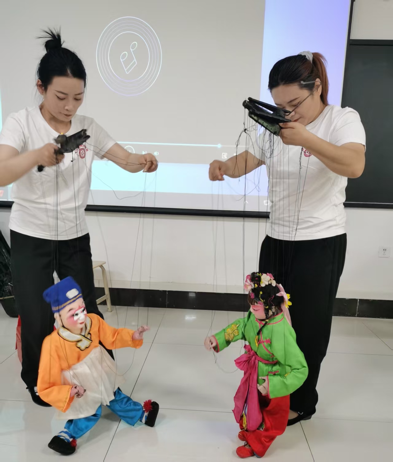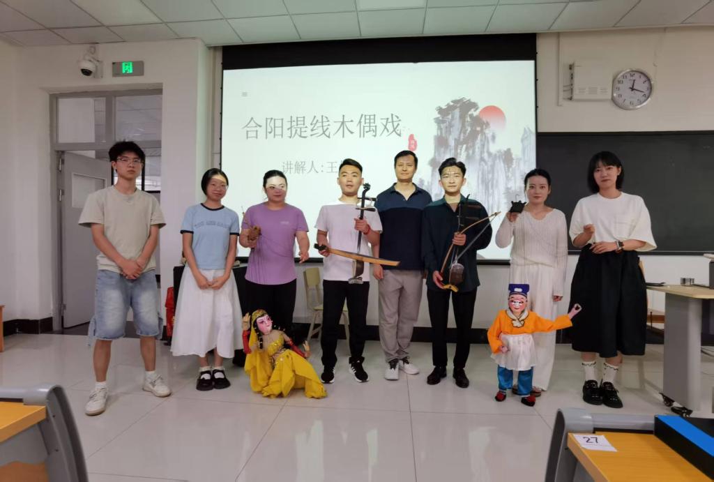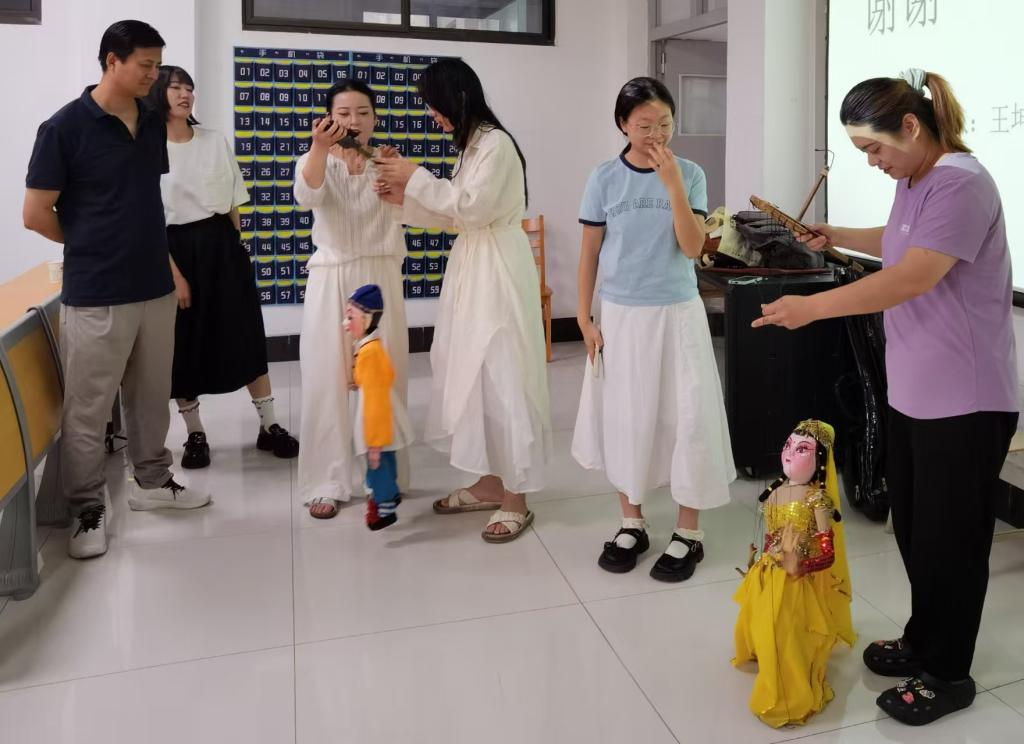 在上午的活动中,王坤从合阳提线木偶独特的唱腔及木偶道具为切入点,边讲解边安排演员进行现场表演,生动鲜活的讲解了合阳提线木偶的起源、剧团的历史辉煌及当前的发展现状。同时,他们还带来了《卖货郎》《天竺少女》等经典剧目的展演,并指导员工亲自操作提线木偶道具,使师生真切感受到合阳提线木偶的独特魅力,也深刻感受到“台上一分钟,台下十年功”的艺术真谛。