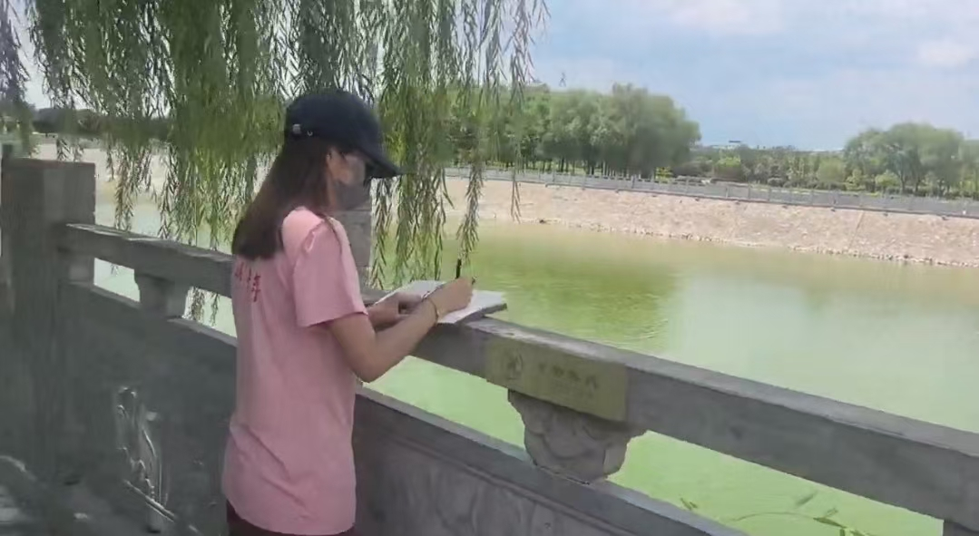 柳树垂丝的河畔,三下乡队员杨浩然同学专注记录。观察水质、留意水生植物,探寻生态密码。这一方碧水,是湿地生态的“晴雨表” ,每一次数据记录、每一眼观察,都在叩响生态保护的思考之门,让我们深知守护水环境,就是守护湿地的生机源泉。