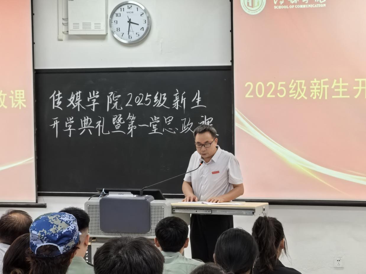 教师代表张晨曦老师提到,人工智能正深刻改变传媒行业,同学们不必因AI的强大而焦虑,而应与其协同发展,发挥创造、情感、审美与道德等AI难以替代的特质,实现自身价值。他希望新生在大学四年中,既锤炼专业技能,又通过广泛阅读与思考不断提升自我,成长为不可替代的传媒人才。