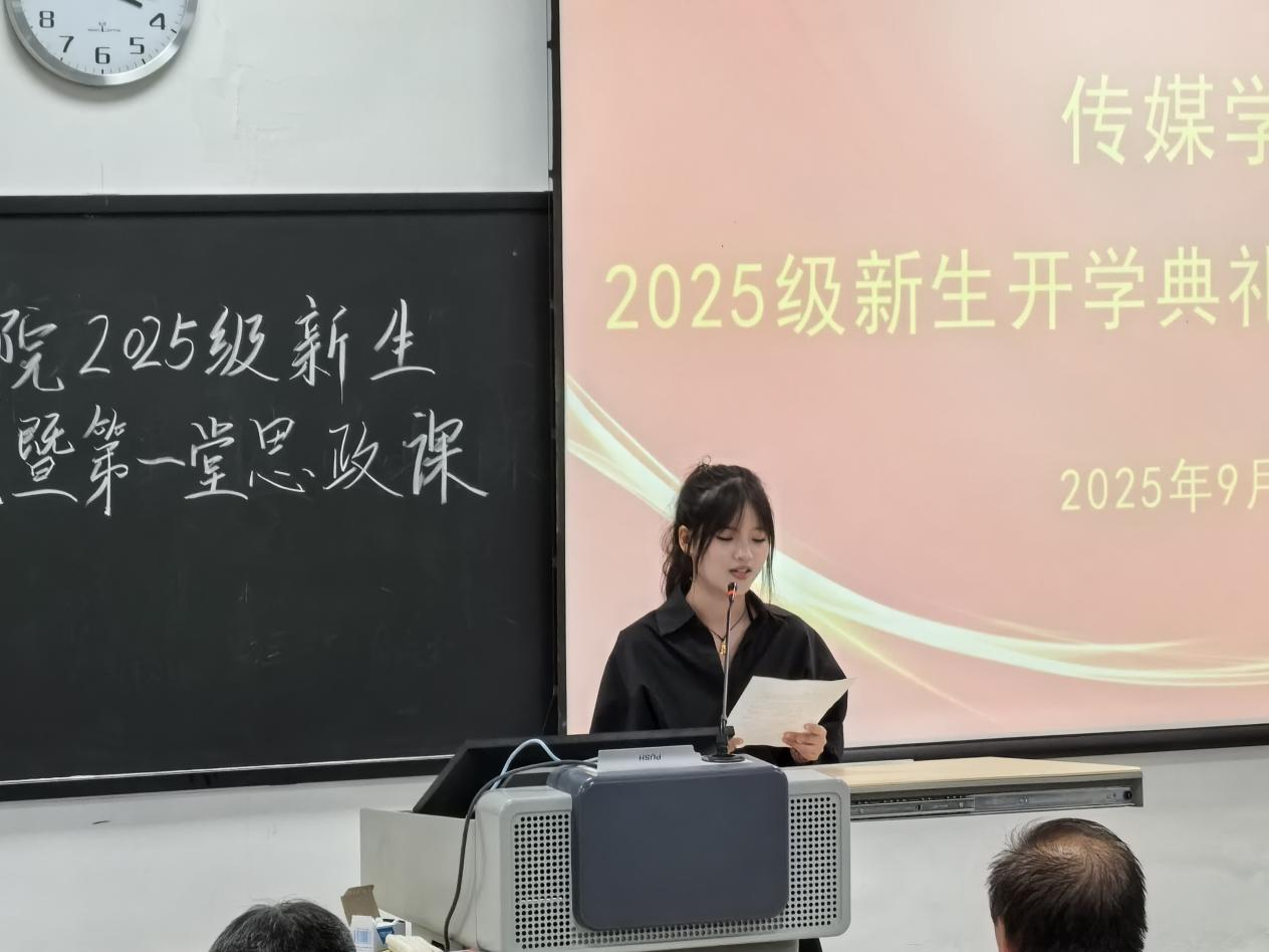 广播电视编导231班邹涵睿代表在校生发言,她分享专业学习心得,鼓励新生积极把握实践机会,主动在传媒领域探索,以热爱与坚持追逐梦想,共同成长。