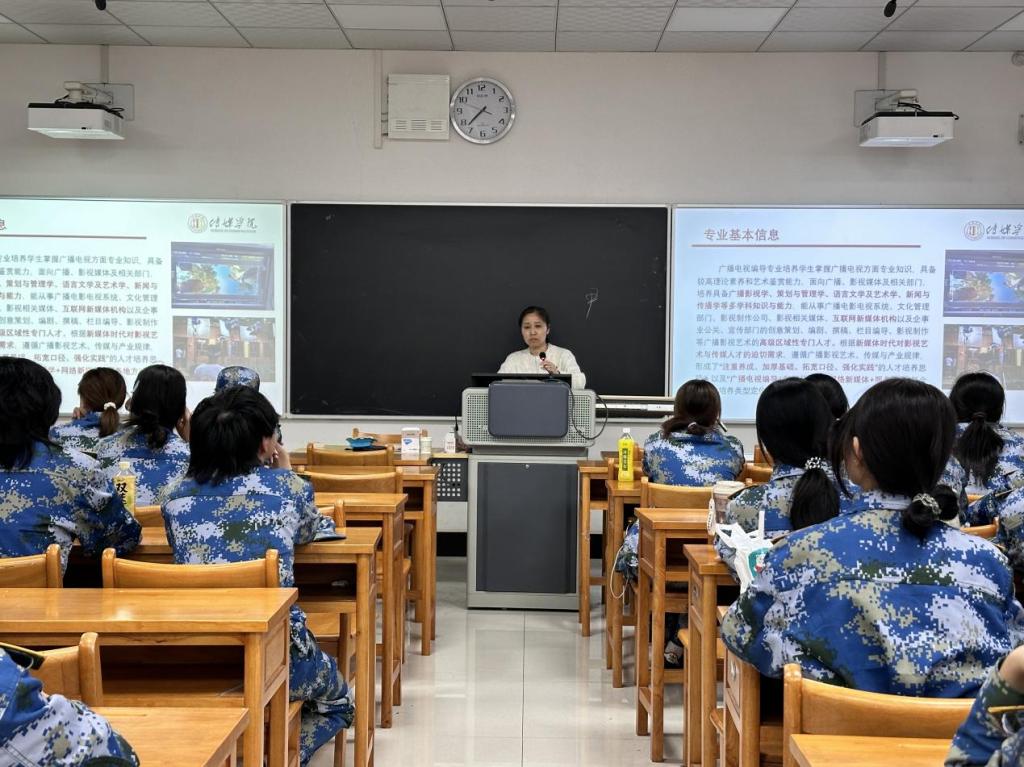 为帮助新生深入了解学科内涵、明确学习目标、科学规划老员工涯,公司于2025年9月25日晚在138教室召开2025级新生专业认知会。广播电视编导专业负责人尹晓利、数字媒体艺术专业负责人程昌华、动画专业负责人张小波、戏剧影视美术设计专业负责人张鸽舞及全体2025级新生参加了本次专业认知会。