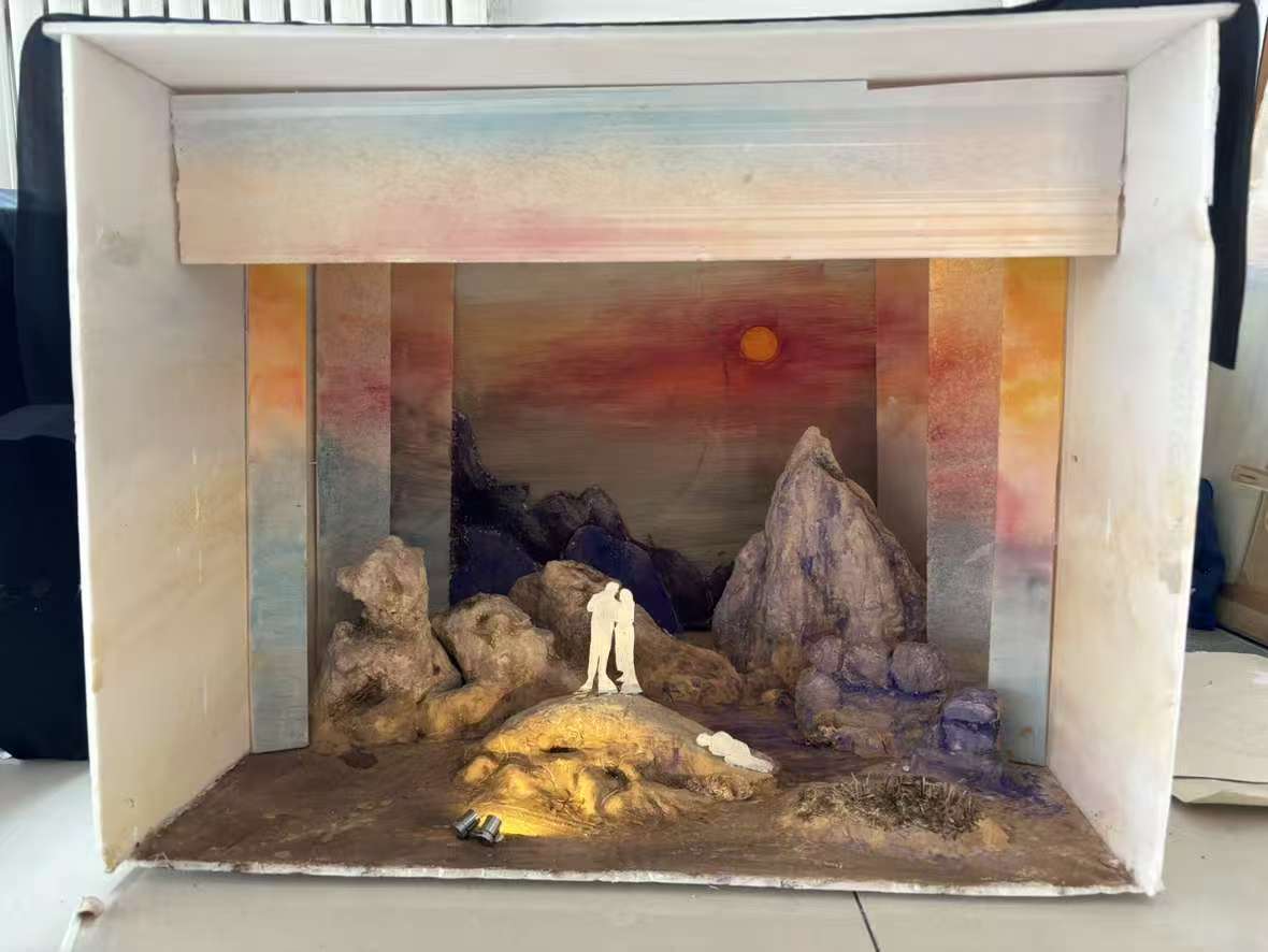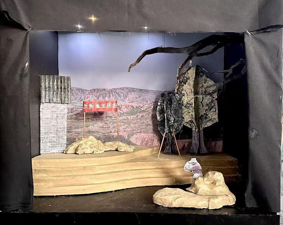 舞台设计采用的是妮子被饿死的这一章节,当时正是人民在烽火交加的时代,饥寒交迫,在妮子快被饿死的时候薛自强出现了,他给了妮子馒头,为了体现出他的高尚让他的站位在上,而妮子相对靠下。造型特征:运用了高低错落的山来体现高差,人物作为点进行点缀,屏风为线给它们进行统一。表现手法:前景超轻粘土和石膏绷带做山,中景上了重色与前面拉开距离,远景做了颜色更重的景片表现一下远山,背景画了落日来体现妮子的生命正走到尽头,也暗示了反动派土匪最终的败落。