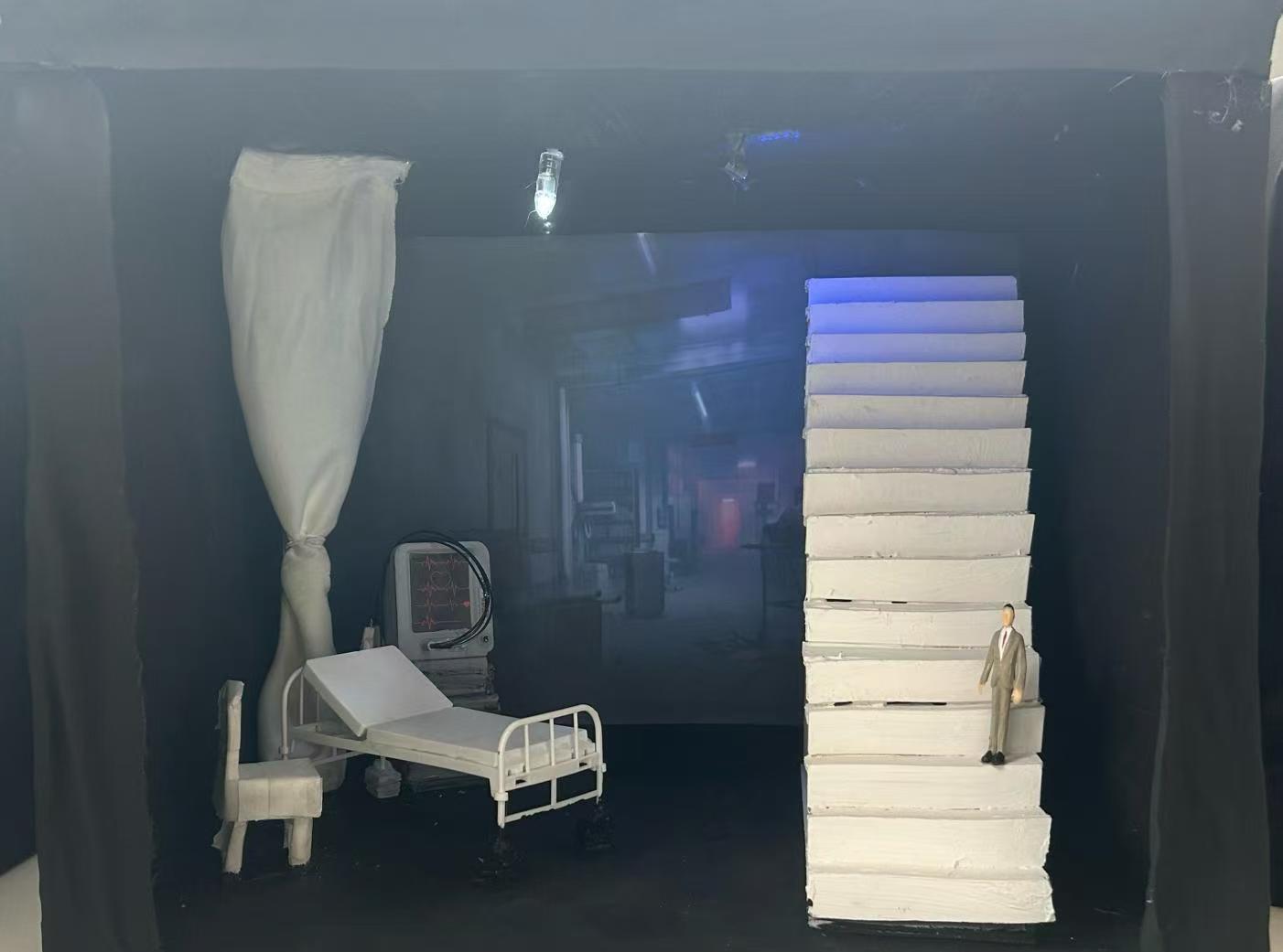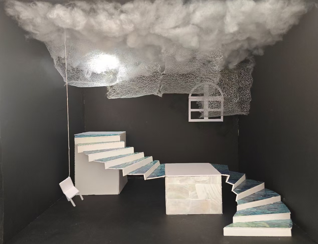 作品是薛刚与灵魂进行对话的场景,这是一个虚拟的空间,里面的角色有薛刚与灵魂,周围的事物都是虚幻的,飘渺的。主角所在空间道具都有具体的形状,十分规整。里面的装饰物是一些轻飘的,虚无的也。两个长方体平台与楼梯是供主角进行交流的,规整的楼梯与平台展现了虚幻空间的秩序感,水波纹使楼梯变的似有似无,平台上的云母贝壳也使平台变得梦幻。顶部掉下来的椅子与背景的窗户、云、银纱都展现了空间的虚无。