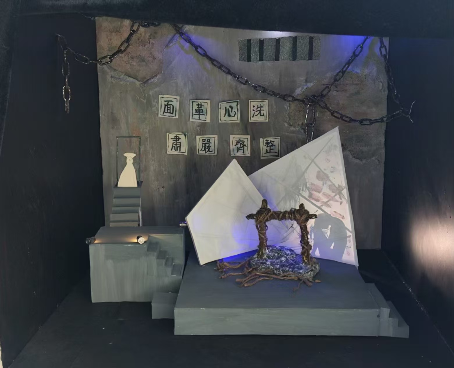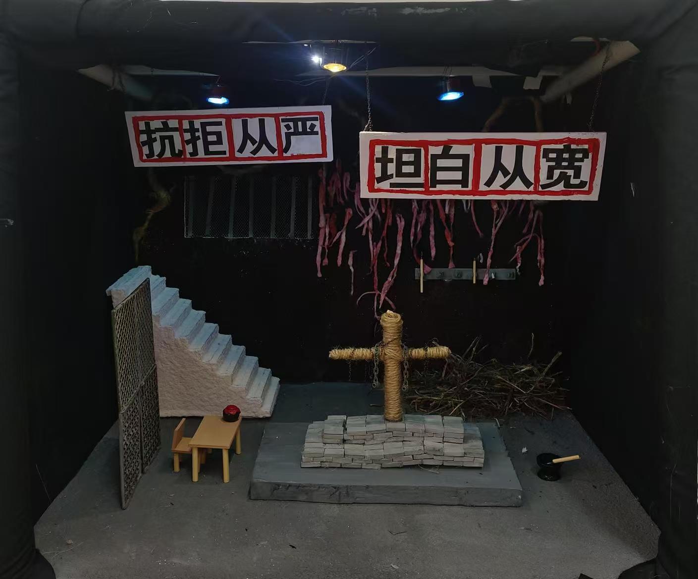这个场景模型营造了一种带有反思氛围的空间。从文字“坦白从宽”“弃旧图新”“真诚悔罪” 等可以推测,这是一个与监狱、悟道相关的场景。场景以砖墙结构为主,给人一种坚固、封闭的感觉,类似监狱的建筑风格。砖块的纹理和颜色处理得较为粗糙,突出了压抑和沉重的氛围。红白相间的布条和绳索从上方垂下,增加了场景的凌乱感和紧张氛围。使用了多种材料来模拟不同的质感,如用泡沫、纸板等材料制作砖墙和平台,通过上色和纹理处理来增加真实感。绳索和布条的使用也增强了场景的层次感和真实感。象征手法来传达主题。