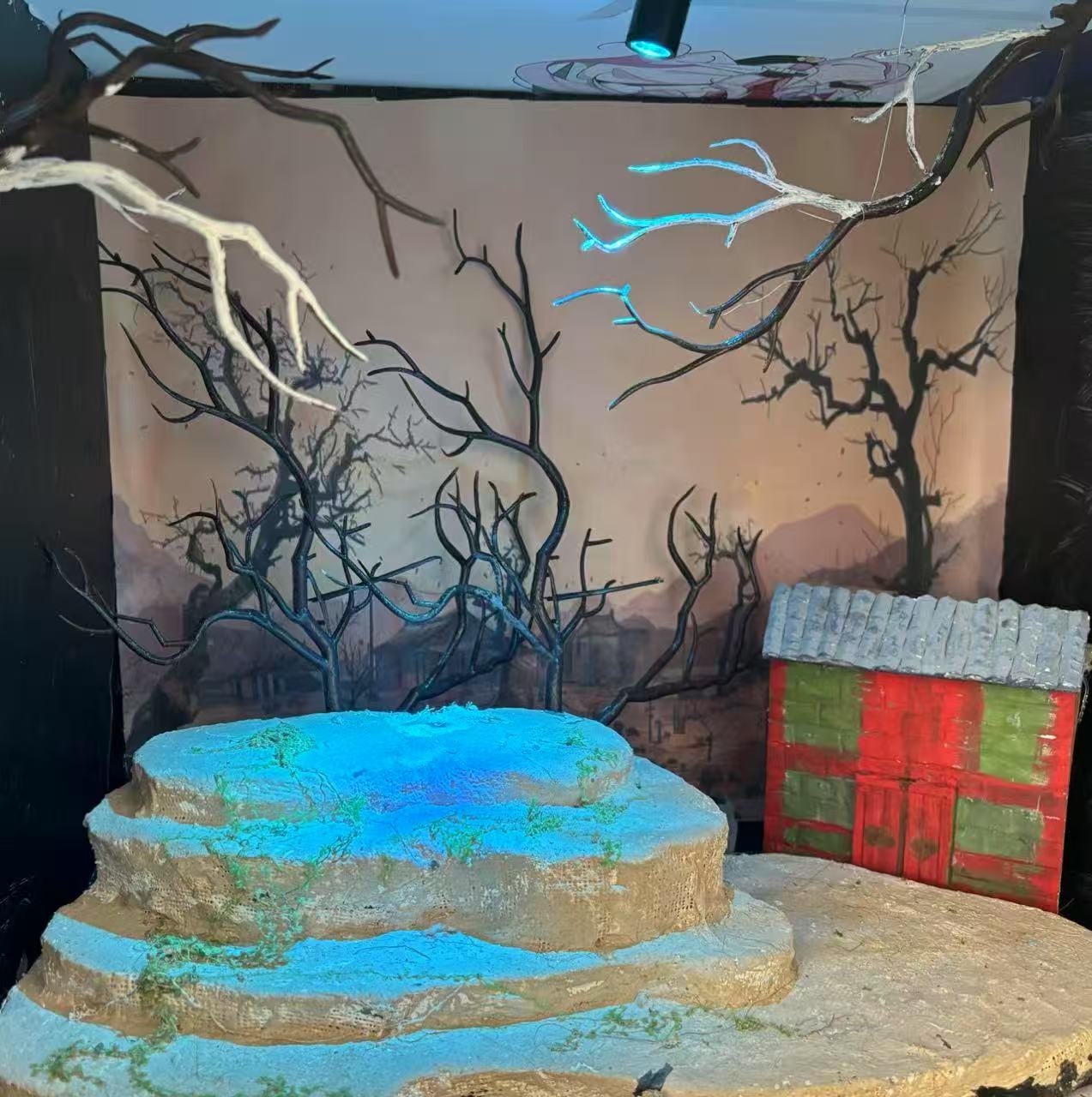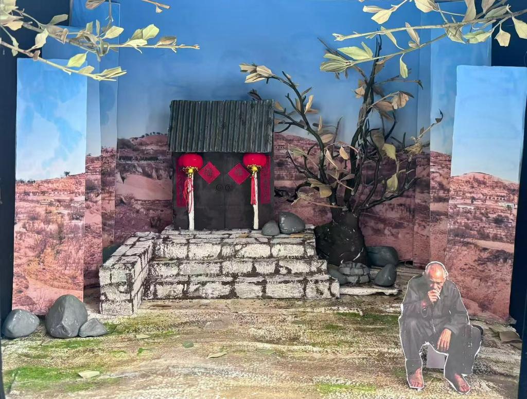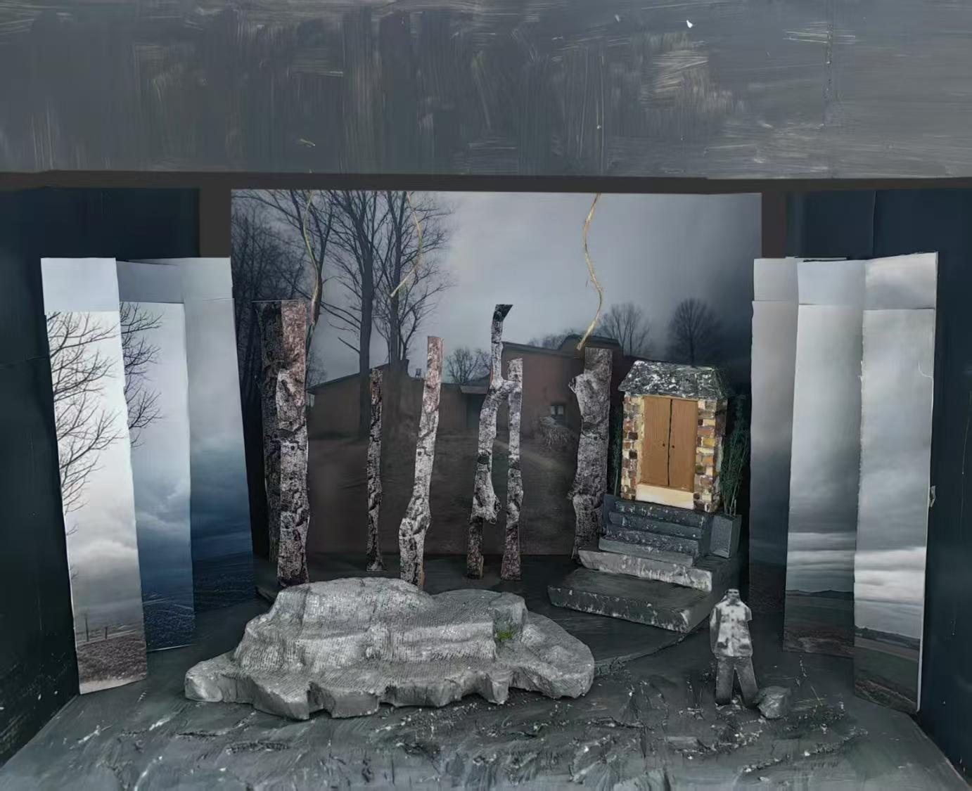 采用实物模型与平面背景相结合的方式。实物模型部分,如小屋、石阶、枯树等,通过精细的制作和材质的选择,营造出逼真的质感,让观众仿佛能触摸到乡村的一砖一瓦。平面背景图片则以写实的风格,勾勒出乡村的广袤景象,增强了场景的层次感和纵深感。