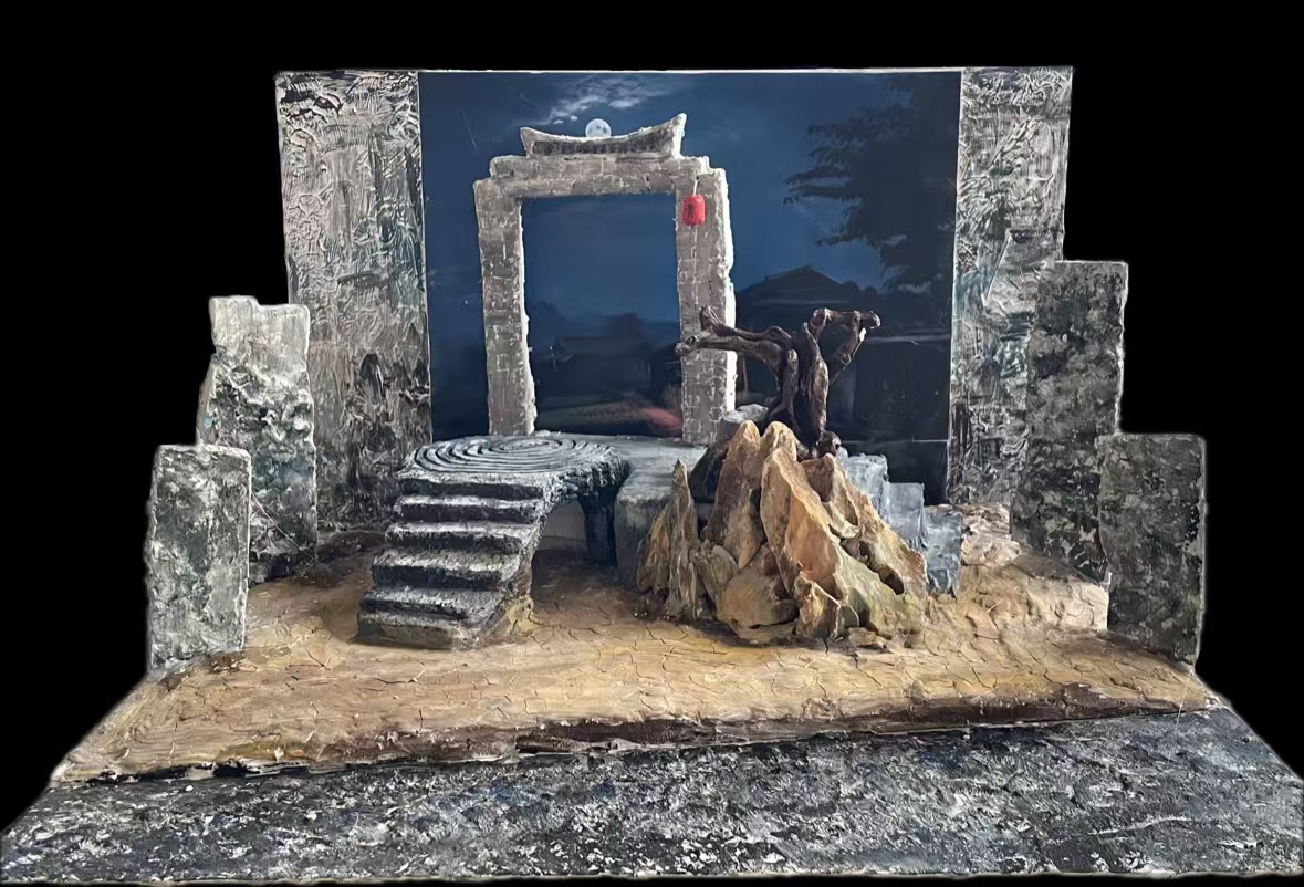 舞台设计意在营造出神秘与怀旧氛围的中式古场景。以月夜为背景,融入传统中式建筑元素,借助意象化的表达,带领观众穿越时空,沉浸于故事所设定的情境之中。舞台中央设置仿石材质的门框,其造型古朴,顶部的中式屋檐设计增添传统韵味。枯树与山石的组合,不仅增添自然气息,还暗示英子的结局。层层递进的台阶,引导视觉,也为演员行动提供空间层次。整体造型在细节上追求逼真质感,如仿石的纹理、枯树的枝干形态,营造出真实可感的古旧场景。运用实物模型与背景画面相结合的方式。实物模型如门框、台阶、枯树等,带给演员表演支点。背景画面绘制月夜景色,营造出静谧深邃的氛围。红色灯笼作为点缀,在暗色背景中尤为醒目,符合中式传统审美,为场景增添神秘,增强舞台的表现力和感染力。