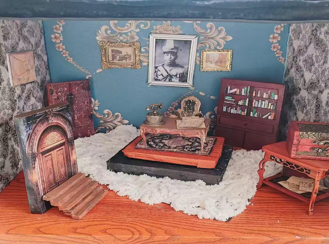 采用微缩模型的表现手法,将场景中的每一个元素都细致呈现。通过色彩搭配,如蓝色的墙面、木质的地板和家具,营造出复古的氛围。利用墙上的照片、书架上的书籍等道具,暗示出人物的身份和场景背后的故事,以小见大,生动地再现了民国时期特定的社会风貌。