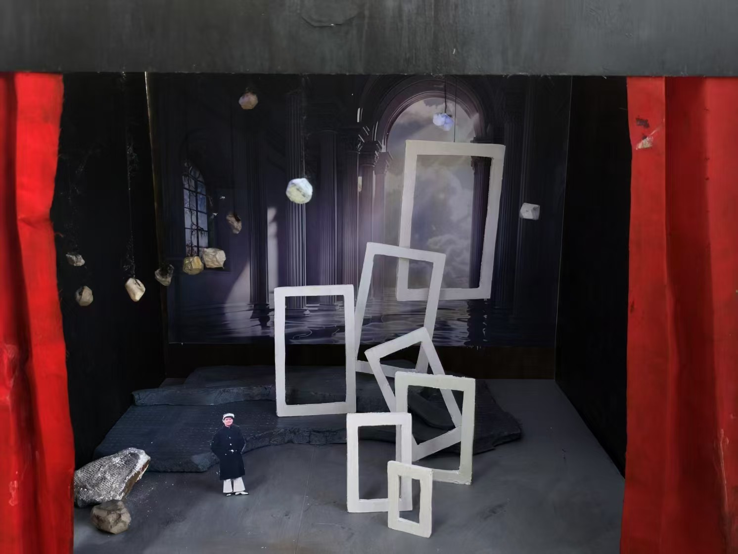 整个作品基于剧本的创越为前提,选择了最后一幕为创作的主要内容。整个作品以舞台为基础,采用三角形构图,可以充分衬托出主体形象。背景则是更为具象的描绘出了“天国之门”。主体运用多个不同大小不同方向的方框作为门的意象。底部制作台阶,顶部增加吊饰,三者参差错落,空间之间的回环牵绕构建出美感。主要运用了不规则重复的艺术手法增强了视觉冲击的力度。同时结合了点、线、面,极大丰富了画面,同时使画面更加完整。