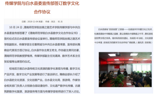 2015级动画专业员工李世琦团队创作的《云的往事》动画片,在第11届全国三维数字化创新设计大赛总决赛上,荣获“数字文化设计方向”唯一的特等奖,获奖金2万元,赛事和作品被中央电视台、陕西电视台、渭南电视台等媒体作了宣传报道。