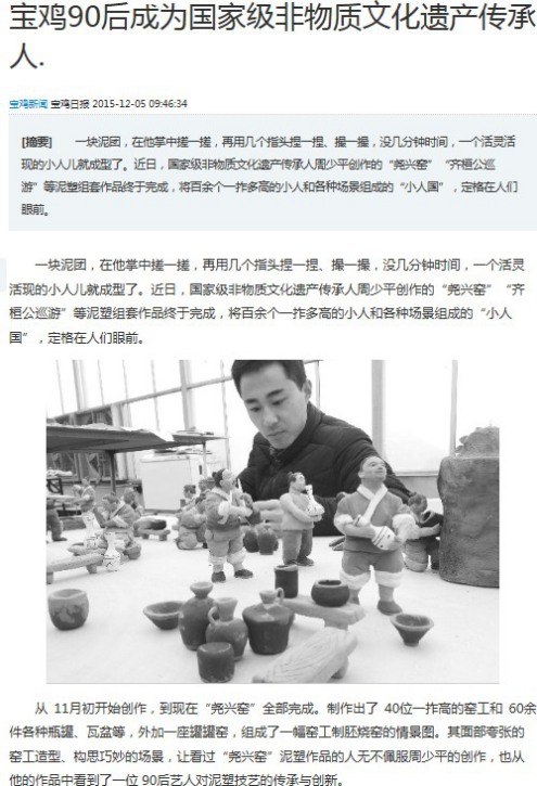 2010级优秀员工周少平,毕业后在家乡从事民俗民风泥塑创业,在传统泥塑中融入“叙事性”,成为宝鸡著名青年雕塑家。